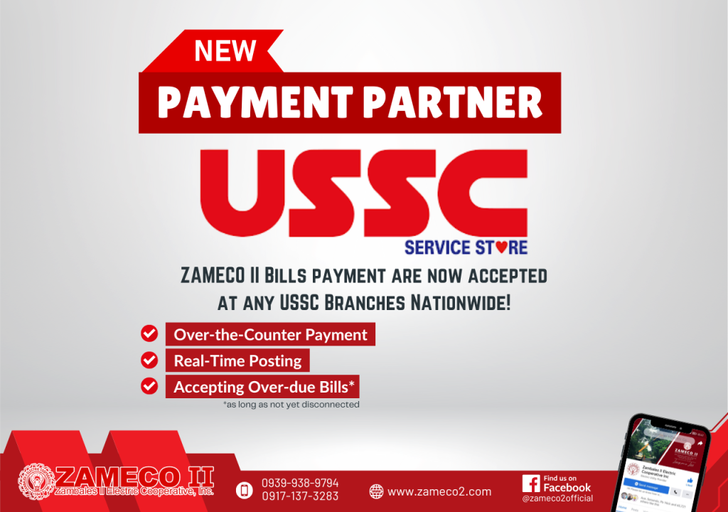 ZAMECO II bills can now be paid at any USSC branch through over-the-counter transactions. Overdue bills are accepted as long as the service has not been disconnected. Payments are posted in real-time.