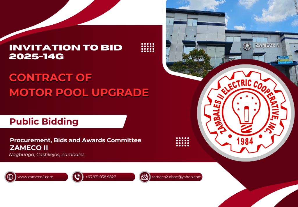 The Zambales II Electric Cooperative, Inc. (ZAMECO II), through its Procurement, Bids and Awards Committee (PBAC), invites all interested bidders to apply for eligibility and to bid for the Contract of Motor Pool Upgrade.