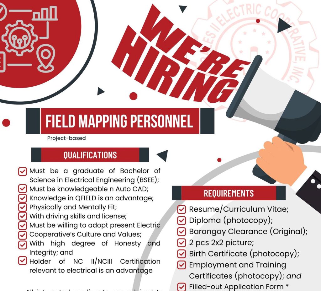 Note: All interested applicants are advised to submit their application with complete documents at Zameco II Main Office, Barangay Nagbunga, Castillejos, Zambales, look for Ms. Ginalyn of HRAD.