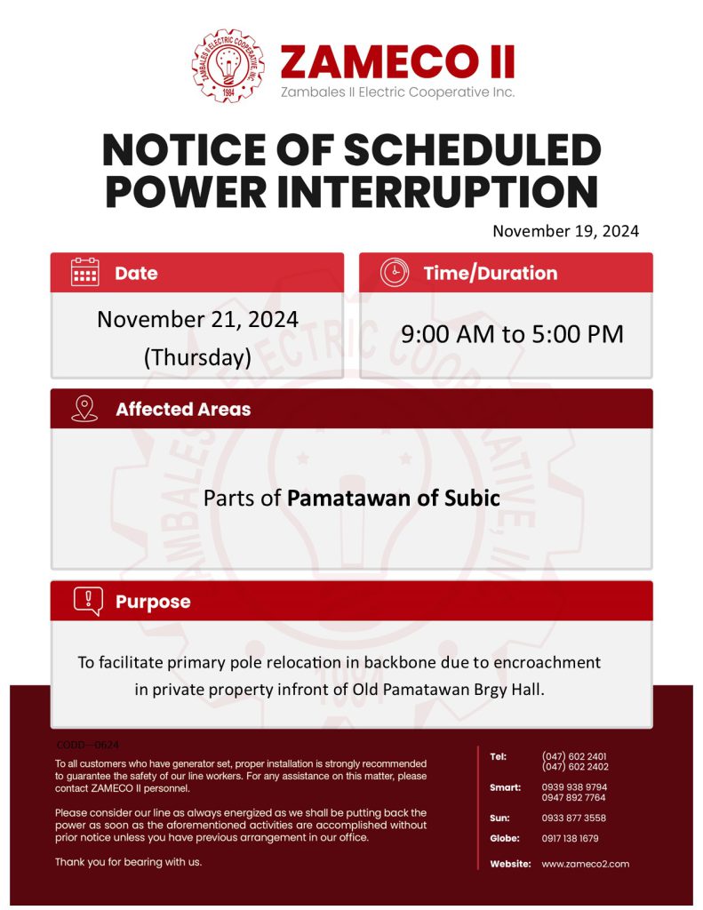 Purpose: To facilitate primary pole relocation in backbone due to encroachment in private property in front of old Pamatawan Barangay Hall